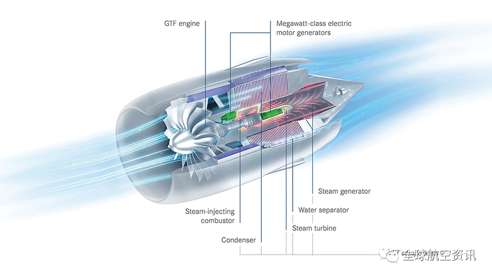在亞音速領域,空客公司還與普惠公司和MTU航空發動機公司合作,參與歐洲“清潔航空”研究計劃下的另一個先進推進項目Switch。Switch的目標是在21世紀30年代中期投入使用,目標是減少25%的二氧化碳排放,減少80%的氮氧化物排放,并減少不明原因的尾跡排放。在WET概念下,從廢氣中收集水,并使用熱交換器將水蒸發成蒸汽。蒸汽被注入燃燒室,從而提高了燃料效率。